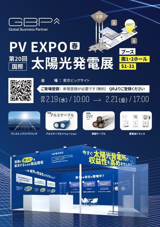 再生可能エネルギー、EV自動車部品、AI及びIoT領域における先進技術を駆使し、グローバルで急速に成長している,~再エネ業界の風雲児~ GBP株式会社(本社:東京、以下GBP)は、2025年2月19日(水)より3日間、東京ビッグサイトにて開催される「PV EXPO【春】第20回 [国際] 太陽光発電展」に出展します。ワンストップリパワリング、アルミケーブルソリューション、銅線ケーブル、蓄電用トランスなどを展示します。