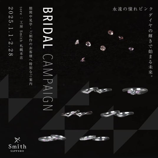 株式会社一宝(所在地:北海道札幌市、代表取締役:懸谷 正人)が運営する、北海道の手作り結婚指輪・婚約指輪専門店「工房Smith札幌本店」は、「Bridal Campaign 2025」を、2025年1月15日~2025年2月28日の期間限定で実施いたします。