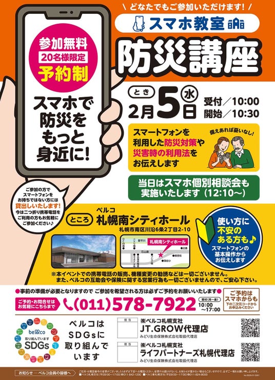 株式会社ベルコが運営する「札幌南シティホール」では、2025年2月5日(水)に「スマホ教室 防災講座」を開催いたします。このイベントでは、災害時の備えとして、スマートフォンを活用した防災対策や緊急時の活用法をわかりやすく解説します。さらに、持続可能な社会を目指すSDGs(持続可能な開発目標)と防災意識の関係性についても学べる内容です。