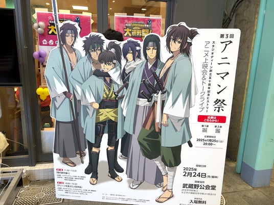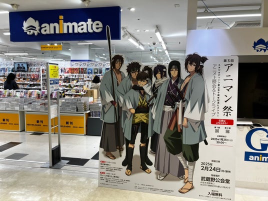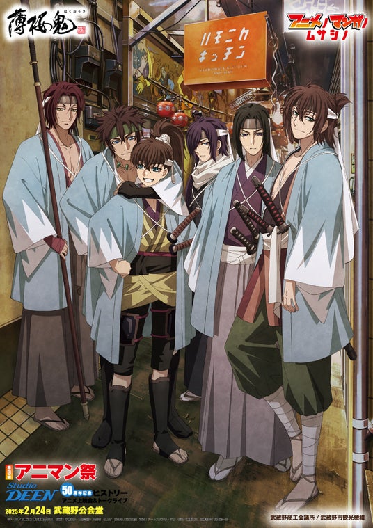 2024年度アニメノマンガノムサシノは、アニマン祭で協力する大手アニメ制作スタジオ「スタジオディーン」とのコラボレーション企画として、同スタジオ近年の代表作のひとつであるTVアニメ『薄桜鬼』シリーズを題材に、本年度のキーヴィジュアルを作成しました。すでにポスター等で発表されているこのキービジュアルを活用し、イベント告知を兼ねた等身大ポップを作成。2025年1月17日より、吉祥寺サンロード「J:COMショップ」前、「アニメイト吉祥寺パルコ」店頭に設置を開始しました。