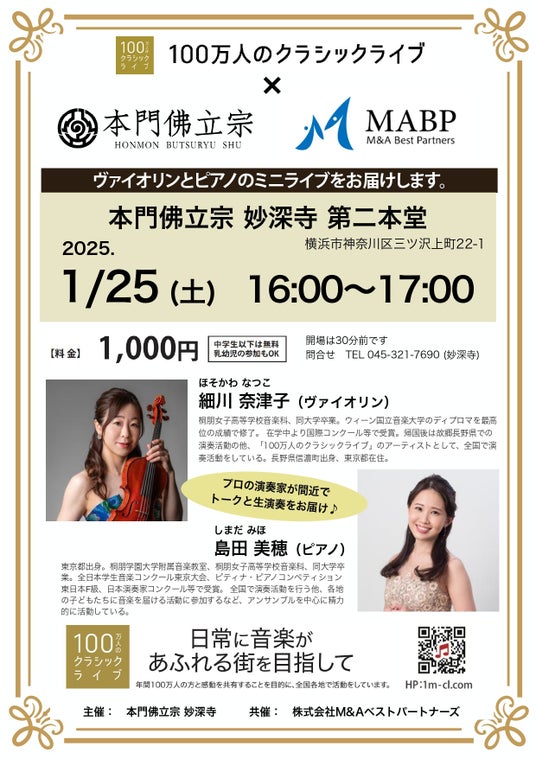 製造、建設、不動産、医療・ヘルスケア、物流、ITに特化したM&A仲介を行う株式会社M&Aベストパートナーズ(本社:東京都千代田区、代表取締役社長:齋藤 達雄 以下M&Aベストパートナーズ)と、一般財団法人100万人のクラシックライブ(東京都千代田区、代表理事:蓑田秀策 以下100万人のクラシックライブ)は、1月25日(土)16:00より、本門佛立宗 妙深寺にて、クラシックライブを開催することをお知らせいたします。