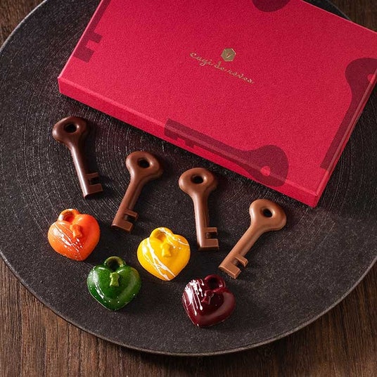 恋人同士が永遠の愛を誓い、二人の名前を書いた南京錠(カディナ)を金網に取り付けて鍵をかけ、その鍵を川に投げ込む「カディナ ダムール」をモチーフにした鍵・南京錠型のショコラアソート。4種の鍵型ショコラとオレンジ、ライム、パッション、カフェの4種の南京錠型ショコラを詰め合わせました。