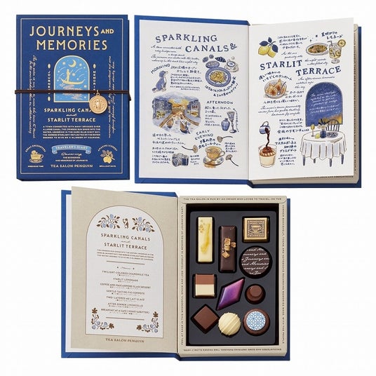 旅好きの店主が営む喫茶店「喫茶ペンギン」。店主が旅先で出会った味わいをチョコレートにして、旅のストーリーが描かれたブック型に詰め合わせました。