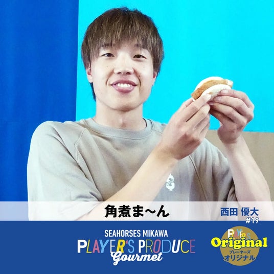 #19 西田優大選手プロデュースグルメ「角煮ま~ん」10時間以上も煮込んだとろとろの角煮をパオで挟んだ角煮ま~んは#19 西田優大選手も「ウマ過ぎでしょ!」と大絶賛!