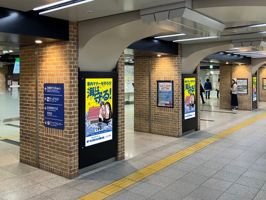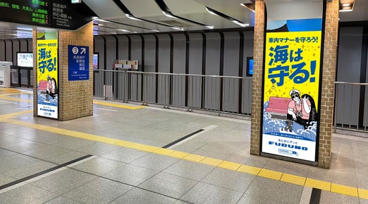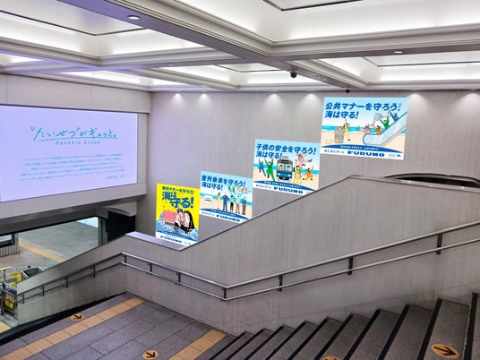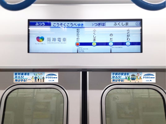 子供の安全を守ろう!海は守る!阪神電車において、駅構内ジャックなど交通広告を展開