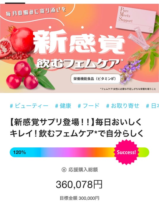 株式会社Mahaloのセルフケアブランド「mycy」Makuakeプロジェクト|フェムケアサプリ「Pure Meets Support」30分で目標達成!