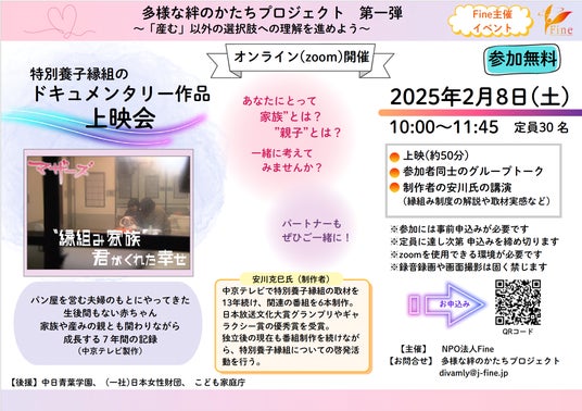 第一弾として、2025年2月8日(土)に「特別養子縁組のドキュメンタリー作品上映会」をオンラインで実施いたします。