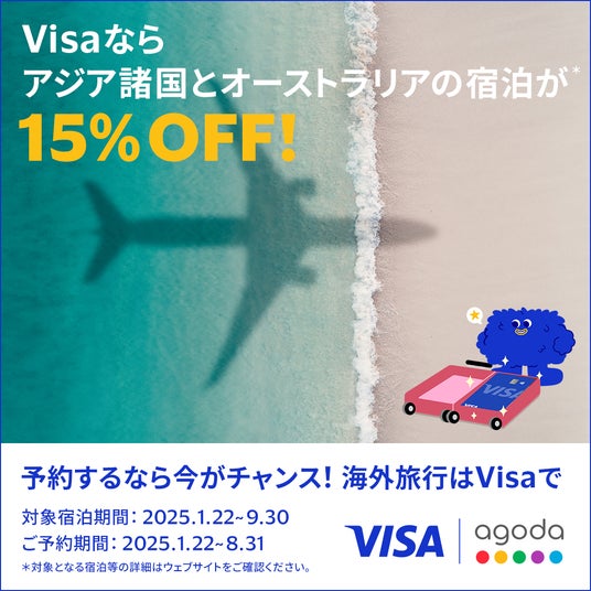 本キャンペーンでは、旅行者がアジア太平洋地域のさまざまな目的地でお得に旅行を楽しむ機会を提供します。Visa優待特典Agodaページよりホテル予約の際、対象のVisaカードにて決済すると、アジア太平洋地域の12ケ国・地域(韓国、台湾、タイ、ベトナム、オーストラリア、フィリピン、インドネシア、シンガポール、香港、マレーシア、中国本土およびマカオ)の対象ホテルの料金が15%割引となります。予約受付期間は2025年1月22日(水)から8月31日(日)、宿泊期間は2025年1月22日(水)から2025年9月30日(火)です。詳細は下記Visa優待特典Agodaキャンペーンサイトをご参照ください。