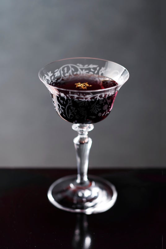 資生堂パーラーが運営する「BAR S」では、ビアズリーの代表作である「サロメ」からインスピレーションを受けてバーテンダーが考案したオリジナルのカクテルをご用意しました。ブランデー、スミレリキュール、桜リキュールにブルーキュラソーを加え、深い黒色に仕上げました。この黒色とグラスの文様は、ビアズリーの作風をイメージしています。ブランデーをベースにしっかりとしたお酒の味わいを活かしつつ、スミレと桜リキュールの香りを加えて"妖艶さ"や"狂気"、そして"愛"を表現しています。