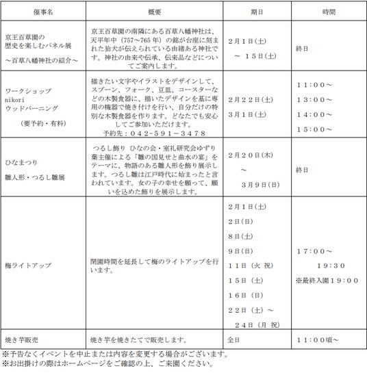 京王電鉄株式会社(本社:東京都多摩市、代表取締役社長:都村 智史)が運営する「京王百草園」(住所:東京都日野市百草560)では、2月1日(土)から3月9日(日)まで、恒例の「梅まつり」を開催します。