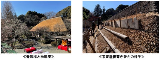 京王百草園は、江戸時代の享保年間(1716年~1736年)に、徳川家康の長男・岡崎三郎信康追悼のために再建された松連寺跡に作られました。松連庵は、園内のほぼ中央、心字池と樹齢300年と言われる名木()を見下ろす位置にあります。建物内部には昔ながらの土間もあり、その上部は茅葺屋根の内側を直接見ることができるほか、その外観と梅の花を合わせた風景は、写真愛好家のお客さまには絶好の被写体となっています。