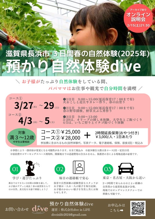 株式会社dive in LIFE(滋賀県長浜市、代表・熊谷理美)は、地元長浜市の幼児・児童に提供していた「預かり自然体験dive」を、2025年の春休みは関東や京阪神など都心で働く共働き家庭の子供たちにも提供する。子どもを預けている間、保護者は仕事はもちろん、趣味や観光など自由に過ごすことができる。