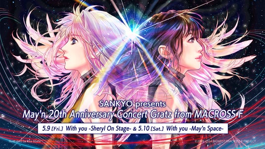 4月に『マクロスF オールタイムベストアルバム「娘々グレイテスト☆ヒッツ!」』の発売を控え、2025年も、なお盛り上がりを見せるアニメ『マクロスF(フロンティア)』。ヒロインのひとり、銀河の妖精 シェリル・ノームの歌を担当しているMay'nの20周年を記念して、5月に横浜で開催されるコラボライブ「SANKYO presents May'n 20th Anniversary Concert Gratz from MACROSS F」から、『マクロスF』キャラクターデザイン 江端里沙氏による新規描きおろしコラボキービジュアルが解禁、そしてMayʼn からのコメントも発表された!