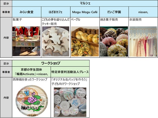 ニッセンは、一般参加の親子によるファッションショーへの衣装提供や、キッズ・レディースファッションの撮影用サンプル商品の特別価での販売。そして、京都の学生団体「輪廻Activate」と協力して西陣織を使用したワークショップを実施します。