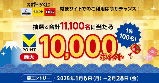キャンペーン期間中にエントリーのうえ、スポーツくじオフィシャルサイト(WINNER・toto・BIG)でスポーツくじを合計5,000円以上ご購入いただくと、抽選で11,100名にVポイントが当たる!