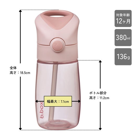 成長に合わせてストローマグから水筒へステップアップしたいときや、飲む量を増やしたい際に最適な380mlサイズの水筒です。ワンタッチで開くプッシュ式の蓋の中は直飲みタイプのストロー。柔らかく角度がついていてくわえやすく、飲みやすいのが特徴です。キャリーハンドルつきの蓋を閉じると漏れにくい設計になっており、お出かけや通園にもおすすめです。