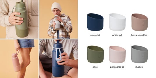 「フリップトップボトル(1L)」専用のバンパー。表面にほこりがつきにくいシリコーン素材を使用しています。独自のエアクッション設計により底への衝撃を吸収。ボトルの底と側面を凹みや傷から保護します。取り付け、取り外しも簡単で、使用後は食洗機で洗えます。(熱源から離してお使いください。)