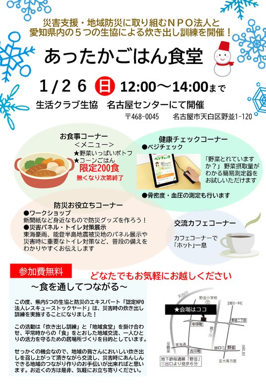 5つの生協とNPO法人による炊き出し訓練「あったかごはん食堂」生活クラブ名古屋センターで1/26(日)開催