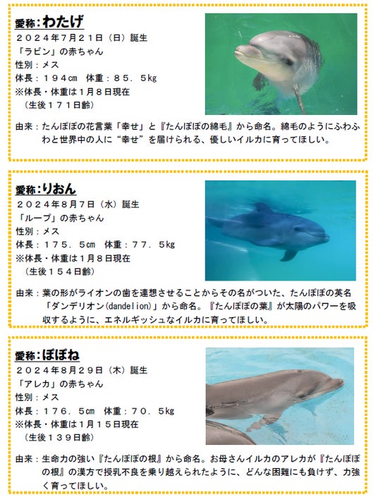 バンドウイルカの赤ちゃんの愛称は3頭とも「たんぽぽ」が由来となっています。