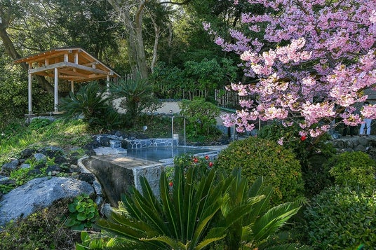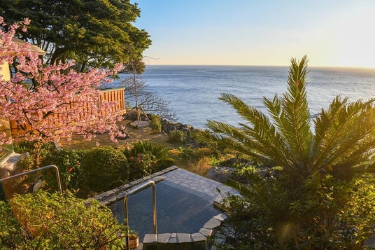 相模湾に昇る朝日、夜はライトアップされた湯船に浮かぶ、ピンク色の夜桜を眺めるお花見温泉。その非日常の体験は心奪われる美しさです。