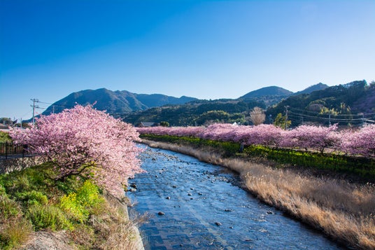 早咲きの河津桜で春を先取り。河津川沿いの約4kmに850本、町全体で約8,000本の桜が咲き、多くの観光客で賑わう「河津桜まつり」。