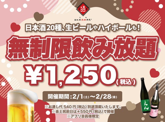 【最大11時間30種飲み放題¥1,250】日本酒原価酒蔵全店で時間無制限飲み放題¥1,250イベントを限定開催┃2月1日~2月28日