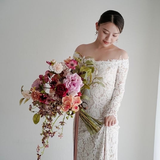 フラワーブーケのワークショップにて作成したブーケと共に、ウエディングフォトの体験が可能です。