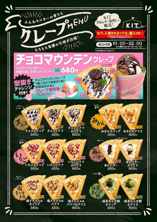KITでは、「チョコマウンテン」以外にも、バリエーション豊富なクレープメニューをご用意しています。チョコやいちご、あんバター、塩キャラメル、抹茶わらび餅など、多彩な味わいをお楽しみいただけます。価格は380円からと、とてもリーズナブル。気軽に楽しめるのも魅力の一つです。