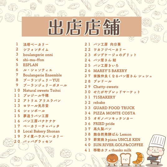 湘南地域を中心とした40店舗以上のパン屋や焼き菓子店が一堂に集結!地元で愛される人気店や隠れた名店、さらに横浜・相模原の話題のパン屋も参加します。普段なかなか行けないお店の商品を楽しむチャンスです。パン好きの皆様には、豪華なラインナップをぜひお楽しみいただきたいと思います。