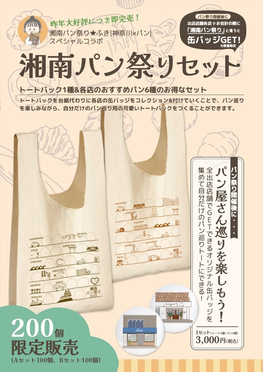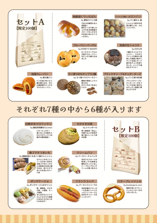 各店舗おすすめのパン6個が詰まった湘南パン祭りセットを200セット販売します。パンは湘南パン祭り特製のトートバックに入っており、地元のパン屋さんをもっと好きになってもらいたいという想いが込められています。
