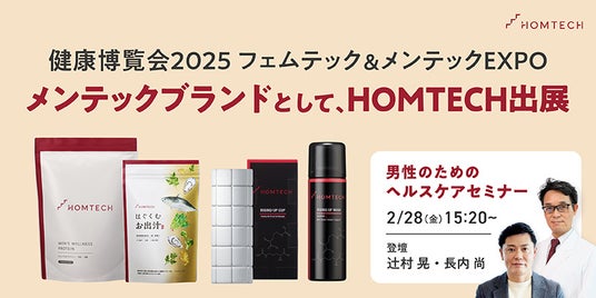 アンファー株式会社(本社:東京都千代田区、代表取締役社長:吉田南音 以下「アンファー」)のメンテックブランドHOMTECH[オムテック]は、健康博覧会2025(会期:2025年2月26日~28日/会場:東京ビッグサイト東 1・2・3ホール)の構成展である『フェムテック&メンテックEXPO』に出展いたします。28日(金)には辻村晃先生とオムテックブランド責任者の長内尚が男性のためのヘルスケアセミナーに登壇いたします。