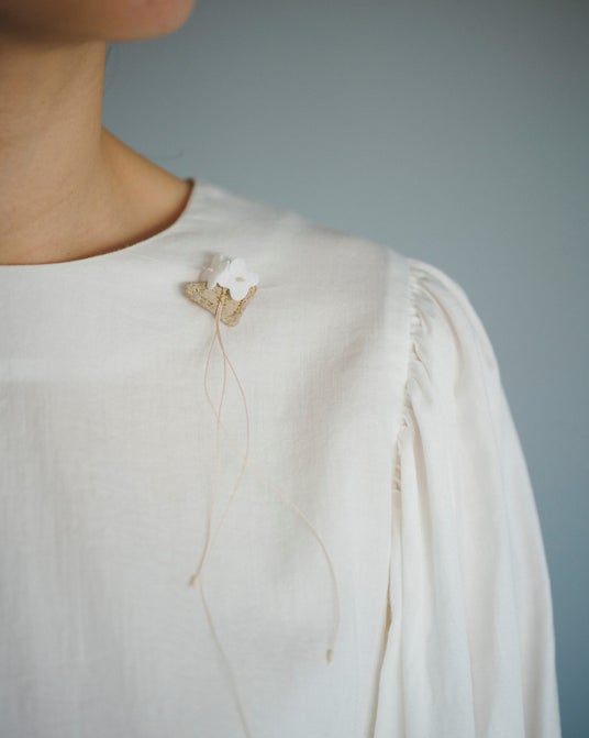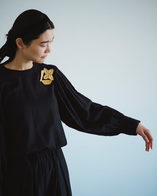 ブローチ:「Go with the wind (gungulparman)」 3,850円(税込・2月中旬発売予定) ブラウス:「blouse "plume" (HAU)」 17,600円(税込)
