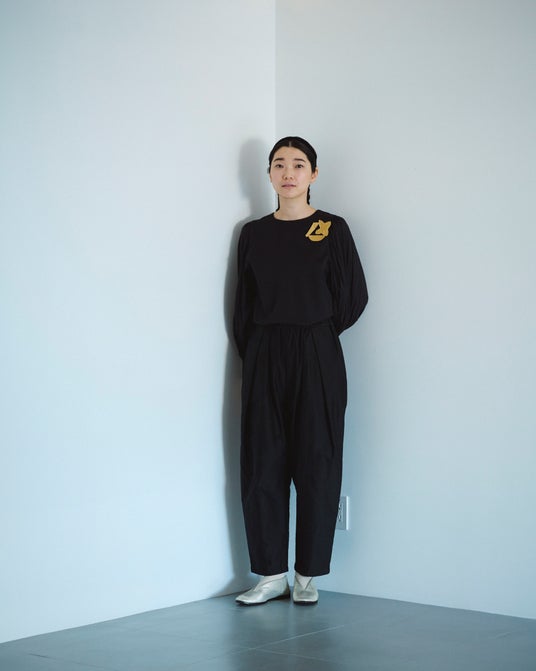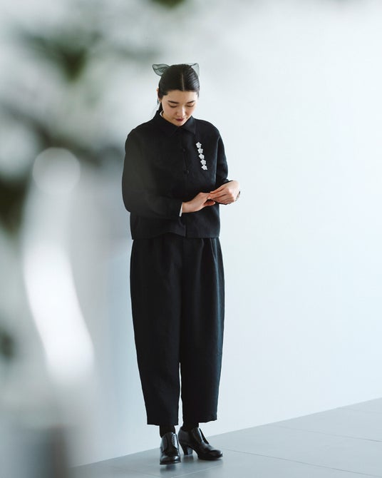 黒いブラウスとパンツを組み合わせたセットアップ風の着こなし。程よくデザイン性のあるブラウスにグラフィカルなブローチを合わせて、メリハリのある装いに。普段はブラウスとパンツをそれぞれ単品で着用し、 オケージョンシーンにはセットアップで。 臨機応変に着回せるのも嬉しいポイントです。