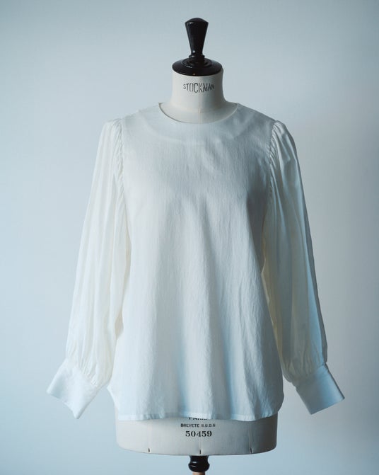 さりげない光沢感が上品な綿サテンの生地を使用した、袖にたっぷりとギャザーの入ったノーカラーブラウス。ボリュームのある袖と相性の良いふんわりとしたAラインのシルエットです。セットアップのインナーとして着用でき、さらにはジャケットを脱いだ時でも存在感のあるものをというテーマでつくったブラウスです。袖をつける位置を肩よりもやや内側にすることで、 肩が張った体型の方でもすっきりとした印象で着用いただける一着に仕上がりました。