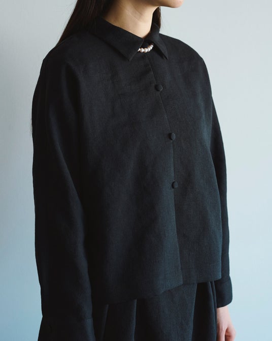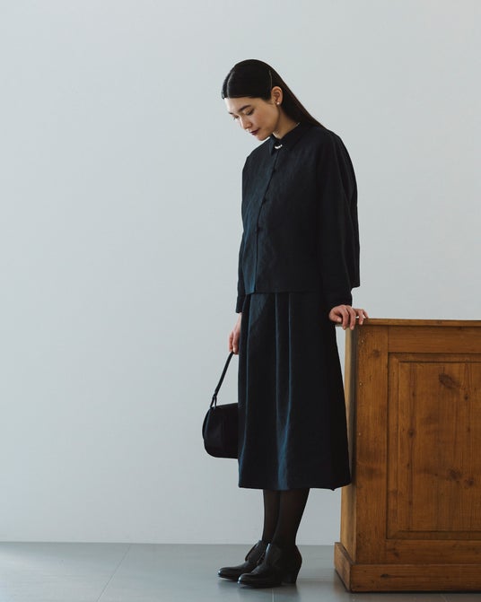 かしこまった式典などに最適な、上品なスカートスーツ。重厚感よりも軽やかな雰囲気のあるスーツスタイルをイメージしてつくったシリーズで、正統派ジャケットに多い "セットイン(アームホールに接ぎがあるデザイン)" ではなくドルマンスリーブにすることと、袖口をシャツのようなカフス仕様にすることで柔らかい雰囲気に仕上げました。ちなみにこちらは自宅でのお洗濯が可能。日常着の延長としてお手入れが楽なことも、おすすめしたいポイントです。