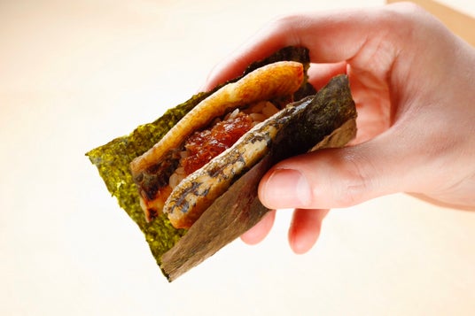 鰻にシャリを挟み、はちみつ+本わさびを合わせたドレッシングをかけて海苔で巻きます。