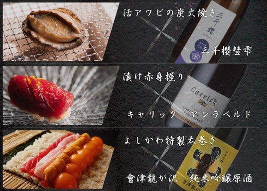 鮨よしかわで提供する鮨をさらに素材にこだわり、さらにエンターテイメント性を追求した別邸限定のコース。鮨に合わせてプレミアム日本酒など、こだわりのドリンクの数々を一緒にご提供させていただく、"ペアリング形式"でのご提供となります。鮨よしかわの中でもここでしか味わうことのできない鮨とお酒の唯一無二の組み合わせ、そして大将が鮨を握る姿を目の前で見ることができる、目と舌で鮨よしかわを存分にお楽しみいただけるコースです。