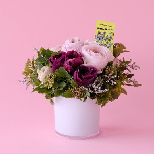 ショップおすすめのラナンキュラスをナチュラルなアレンジメントに仕上げました。器付きでそのまま飾って楽しめます。
