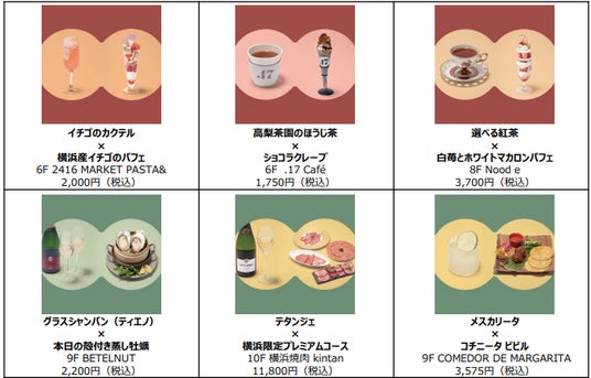 横浜産イチゴのパフェとイチゴカクテルをかけ合わせた春らしいペアリングや、シャンパンと牡蠣などの相性ばっちりなペアリングで、味覚の冒険に出かけられるようなメニューを計24ショップで展開します。春の訪れが楽しみになる、ニュウマン横浜でしか味わえない限定メニューをお楽しみください。
