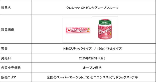モンデリーズ・ジャパン株式会社(本社:東京都品川区 / 代表取締役社長:碇祐輔)は、息スッキリの「クロレッツ」ブランドから、これから旬を迎えるピンクグレープフルーツ香料を使用した新フレーバー「クロレッツXP ピンクグレープフルーツ」を、2025年2月3日(月)より全国で発売いたします。爽やかな香りとさっぱりとした甘酸っぱいフレーバーで、リフレッシュする爽快感とともに、心地よい味わいをお楽しみいただけます。