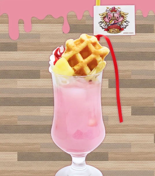 25周年記念グル~ミ~ドリンク25周年エンブレムをイメージし、ワッフルやパイナップルを盛り、金色のストローやリボンを飾り付けた豪華なドリンク。