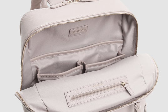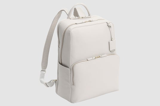 小物収納にぴったりな前面ポケットや、背負ったままアクセスできる背面ポケット、折り畳み可能なボトルホルダーといった忙しい毎日に役立つ充実の機能を備えており、使い勝手は抜群です。本体に、お手入れしやすく傷が目立ちにくいエンボス合皮素材を使用しているため、長く綺麗にお使いいただけます。オフィススタイルからカジュアルスタイルまで、幅広いシーンで活躍します。