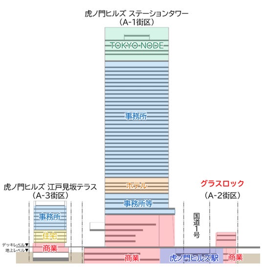 「虎ノ門ヒルズ」は、東京都心部における新たな交通結節点として、環状2号線、大規模バスターミナル、東京メトロ日比谷線「虎ノ門ヒルズ駅」と一体的に整備した広大な駅前広場、幅員20mの大規模歩行者デッキなど、地上・地下・デッキレベルの重層的な交通ネットワークを強化・拡充してきました。「森タワー」と「ステーションタワー」の中心に位置し、2階部分を大規模歩行者デッキ「T-デッキ」が貫通する、地上4階・地下3階、延床面積約8,800平方メートル の「グラスロック」が開業することで、「ステーションタワー」の再開発事業が完結すると共に、「虎ノ門ヒルズ」の交通結節機能と回遊性がさらに向上します。