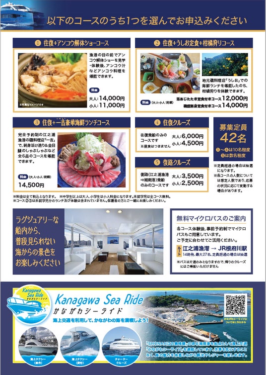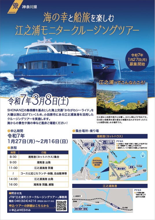 SHONAN江の島桟橋を基点とした海上交通「かながわシーライド」を大磯以西に広げていくため、公共交通ではアクセスしづらい江之浦漁港(小田原市)と周辺施設を組み合わせたモニタークルージングツアーを実施します。海からの景色や海の幸など是非ご堪能下さい!