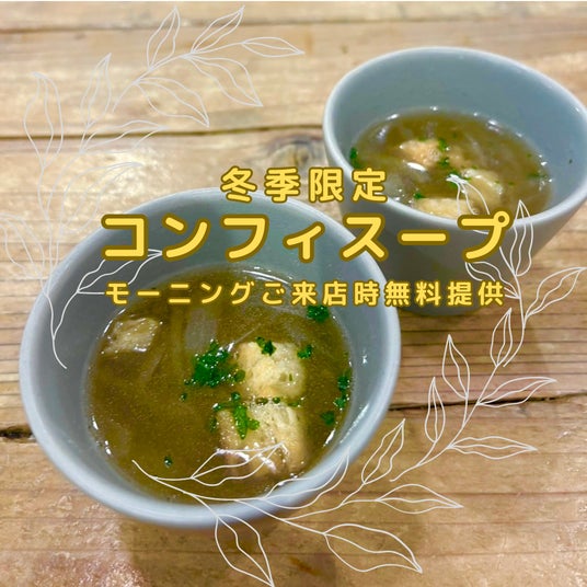 冬季限定コンフィスープモーニングタイムにご来店いただいたお客様には、温かいコンフィスープを無料でご提供します。コンフィならではの旨味が詰まったスープで温まりにいらしてください。
