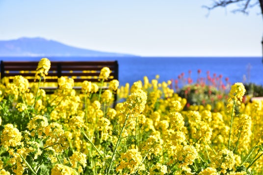また園内では、キダチアロエのとんがり帽子のような赤い花や、伊豆大島を望む花畑には菜の花が青い空と海に映え、ひと足早く春の訪れを楽しむことができます。