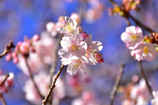 ニューヨークランプミュージアム&フラワーガーデンの桜は"寒桜"という種類で、寒緋桜(カンヒザクラ)と山桜との交配種です。1973年に植栽がはじまり、現在では約100本が早春の城ヶ崎海岸を彩ります。淡紅色の花色はソメイヨシノよりややピンクの色味が濃い印象で、通常は1月上旬頃に咲きはじめ、花の散る2月上旬頃に葉が芽生えます。