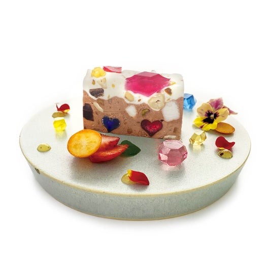 宝石のカッサータの中心には、ハラペコラボの鉱物のような琥珀糖「こうぶつヲカシ」が隠されています。クリーミーなカッサータクリームに映える鮮やかな色合いの「こうぶつヲカシ」は、どこをカットしても美しい断面を楽しめ、光を浴びるとキラキラと輝く宝石のよう。