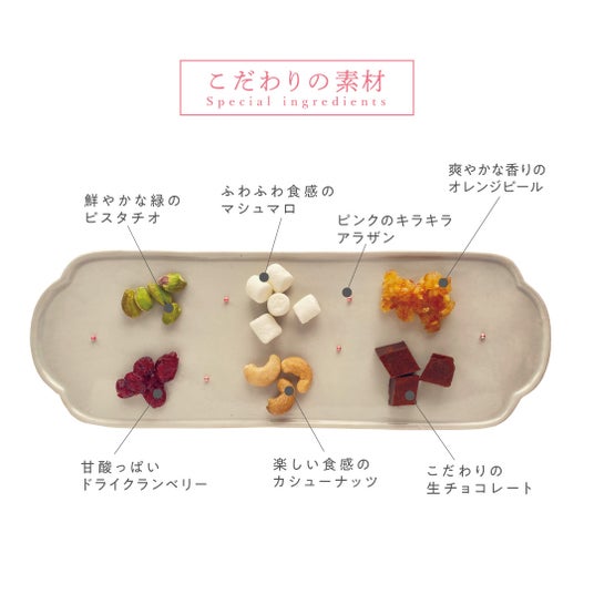 原材料:クリーム(国内製造)、乳等を主原料とする食品(生乳、乳清、クリーム)、チョコレート、生チョコレート、オレンジピール、カシューナッツ、グラニュー糖、マシュマロ、ピスタチオ、ドライクランベリー、ピンクアラザン、寒天、ピーチリキュール、ココナッツリキュール、カシスリキュール、ブルーベリーリキュール、ラズベリーリキュール、かぼす果汁/安定剤(加工デンプン、ペクチン、カラギナン)、レシチン、乳酸、香料、酸味料、トレハロース、アラビアガム、ピロリン酸四ナトリウム、着色料(スピルリナ青、クチナシ黄、アントシアニン、ビートレッド、銀、赤3号、ウコン、コチニール、青)、(一部に乳成分・大豆・カシューナッツ・もも・オレンジ・ゼラチンを含む)