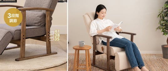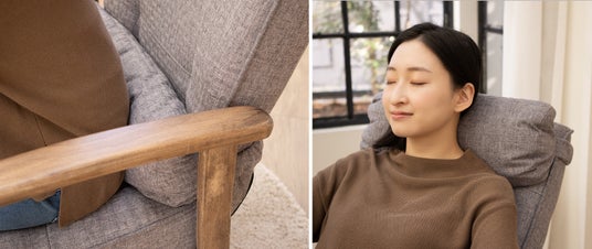 天然木でつくられたゆるやかなカーブの肘掛は、リクライニングの際も肘から腕にかけてフィットするようデザインされ、しっかりと掴みやすい設計。毎日の立ち座りをサポートします。